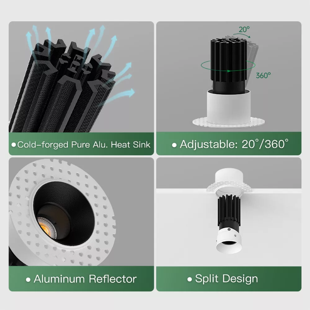 A compact 1 inch recessed adjustable downlight designed for projects that need control, not guesswork. The adjustable head lets you aim light exactly where it belongs, and the tight aperture keeps the ceiling clean. A cold forged aluminum heat sink maintains stable performance, while the split-body system makes installation straightforward and servicing simple. Works well in residential builds, retail, galleries and any space that needs flexible, focused lighting.