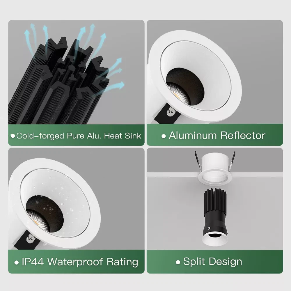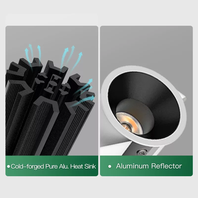 A cold forged aluminum heat sink handles thermal control properly, which helps maintain color accuracy and output instead of letting the LED drift or fade over time. The COB LED and reflector system provides smooth, clean light with minimal glare, which matters in smaller spaces where harsh edges show quickly.