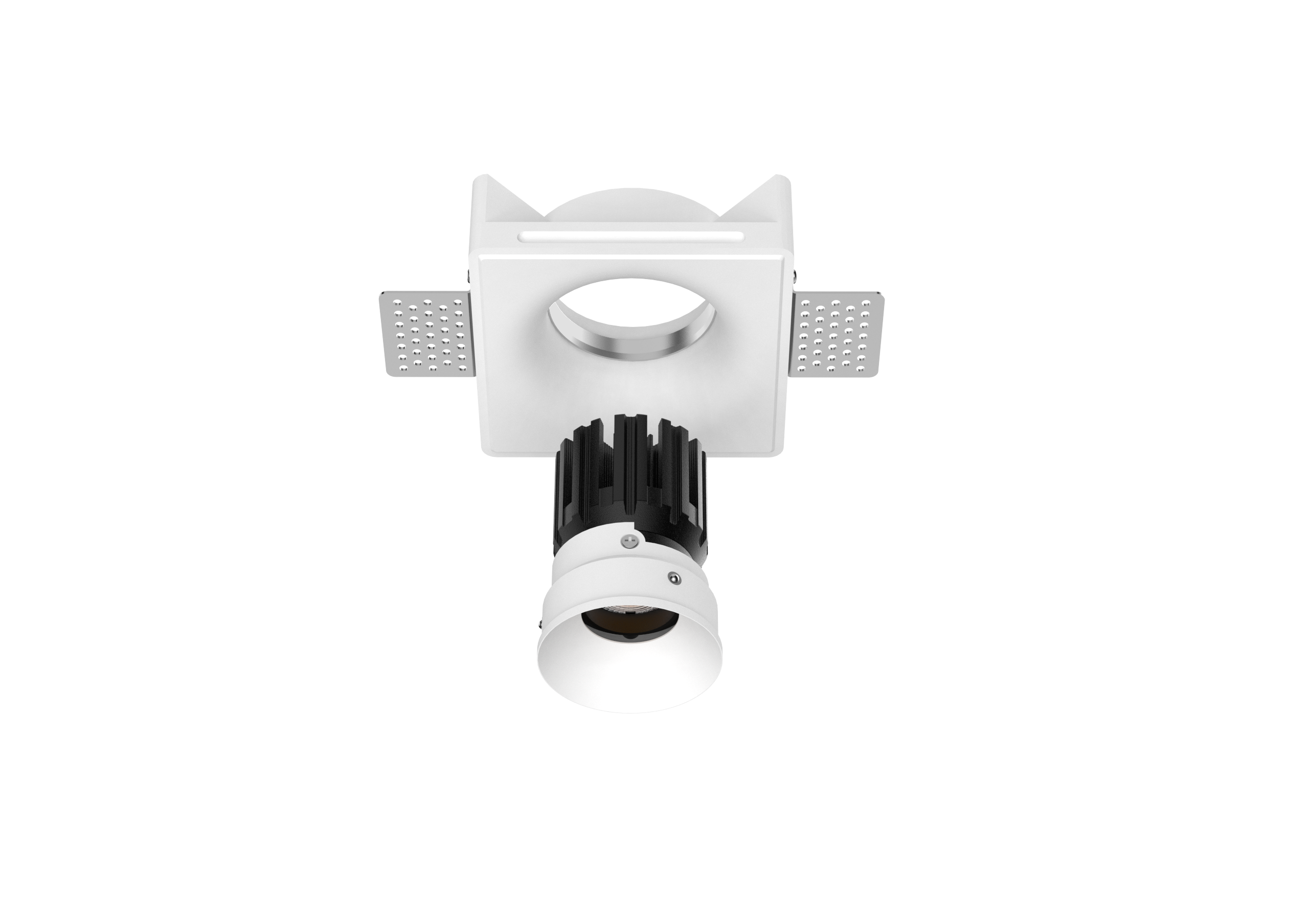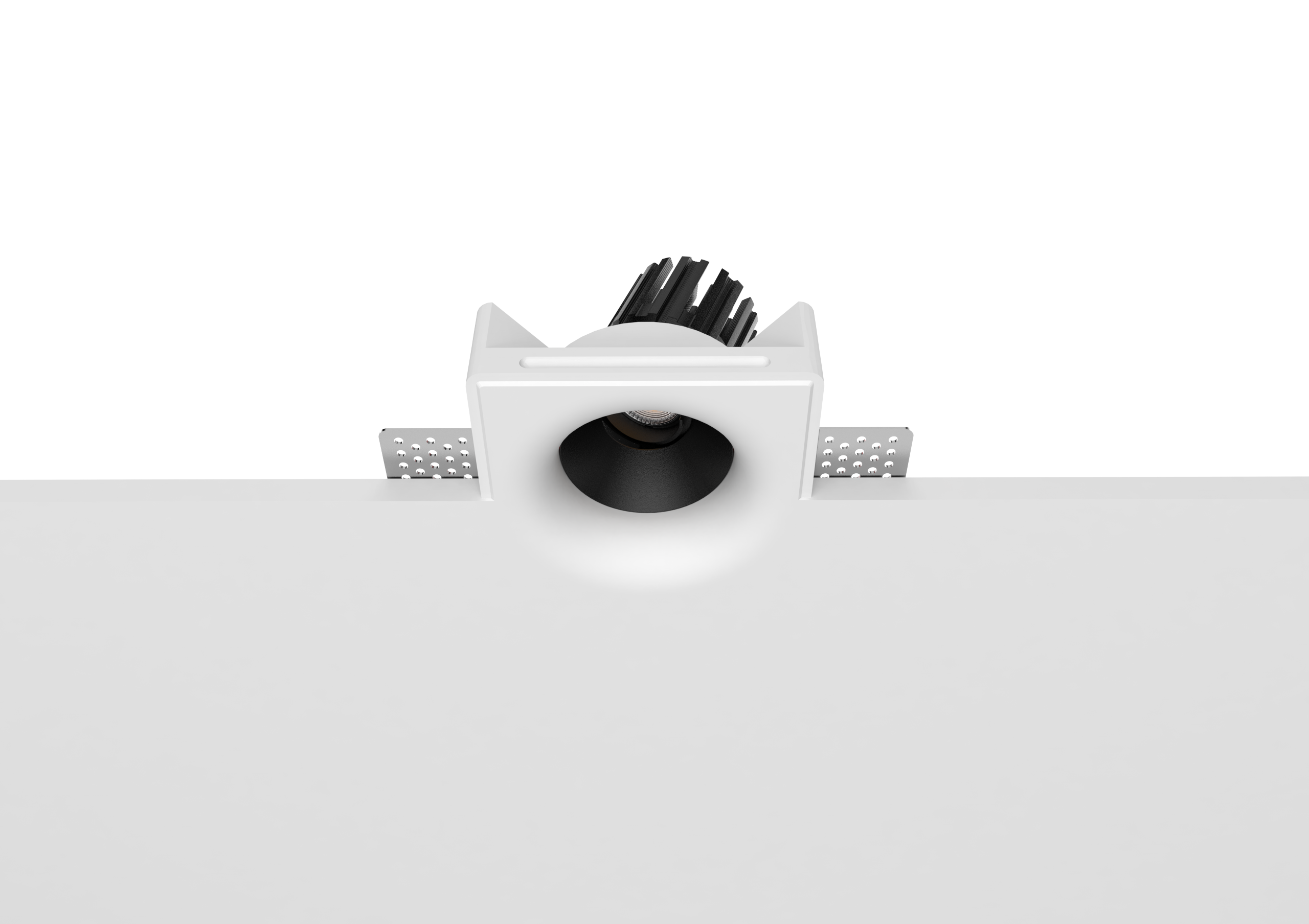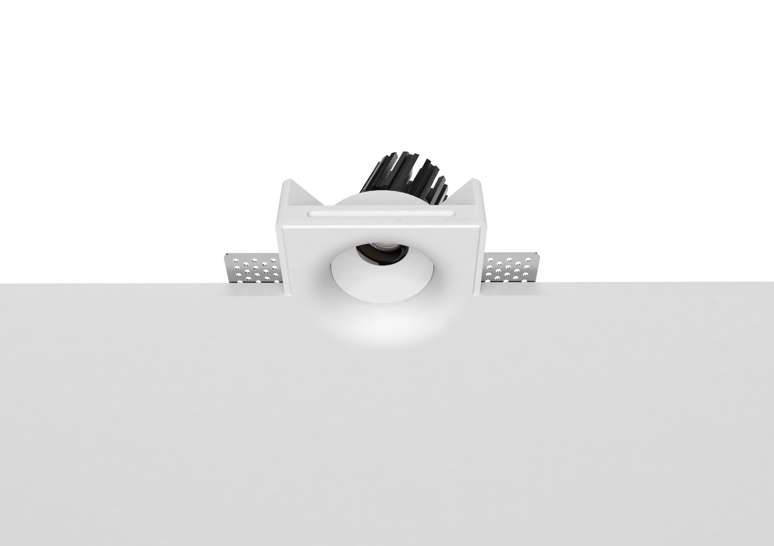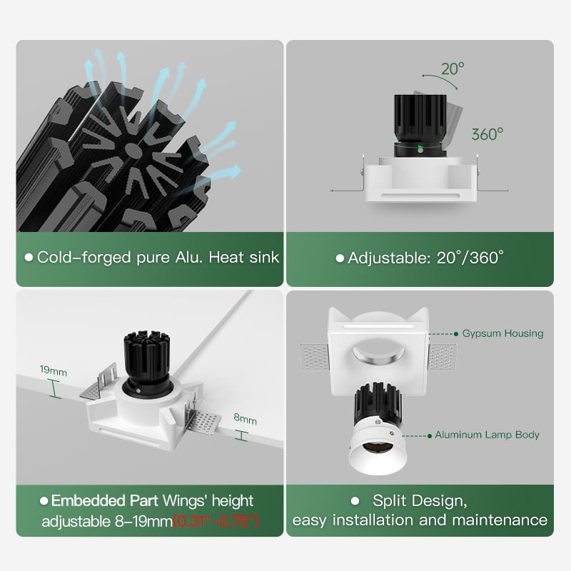 Thermal performance is handled by a cold-forged aluminum heat sink integrated into the lamp body, ensuring stable operation and long-term reliability. The split design allows for easier installation and future maintenance, even after the gypsum housing has been plastered and painted in place.