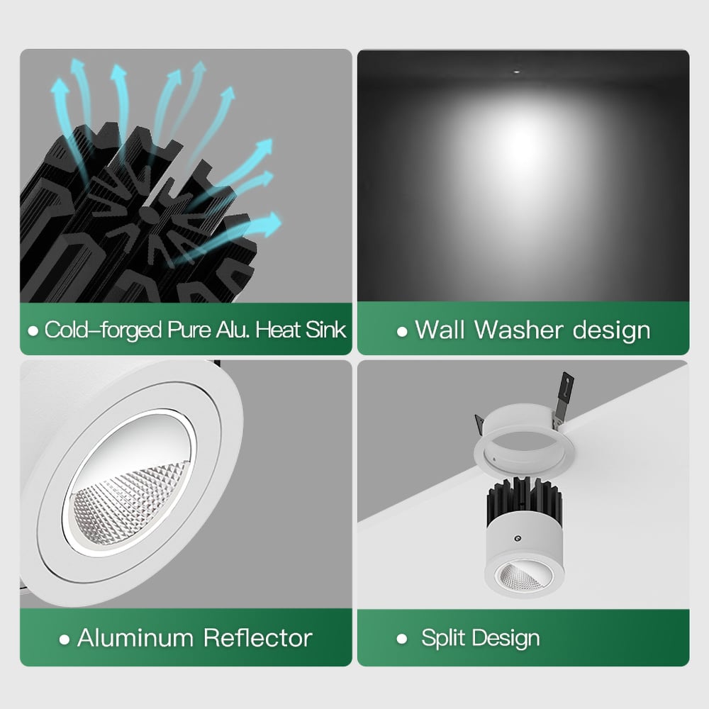 A compact 2 inch recessed wall washer designed to deliver smooth, even vertical illumination with a clean architectural footprint. Available in both micro flange and trimless versions, it lets you match either a subtle finished edge or a fully seamless plaster-in ceiling while keeping the same internal performance. The asymmetric wall-wash optic spreads light uniformly from top to bottom, reducing streaks and hotspots, and making walls feel taller, brighter, and more refined. Built with a high-CRI COB light engine, deep glare-control geometry, and strong thermal design to keep output stable over time in luxury residential, gallery, hospitality, and boutique commercial interiors.
