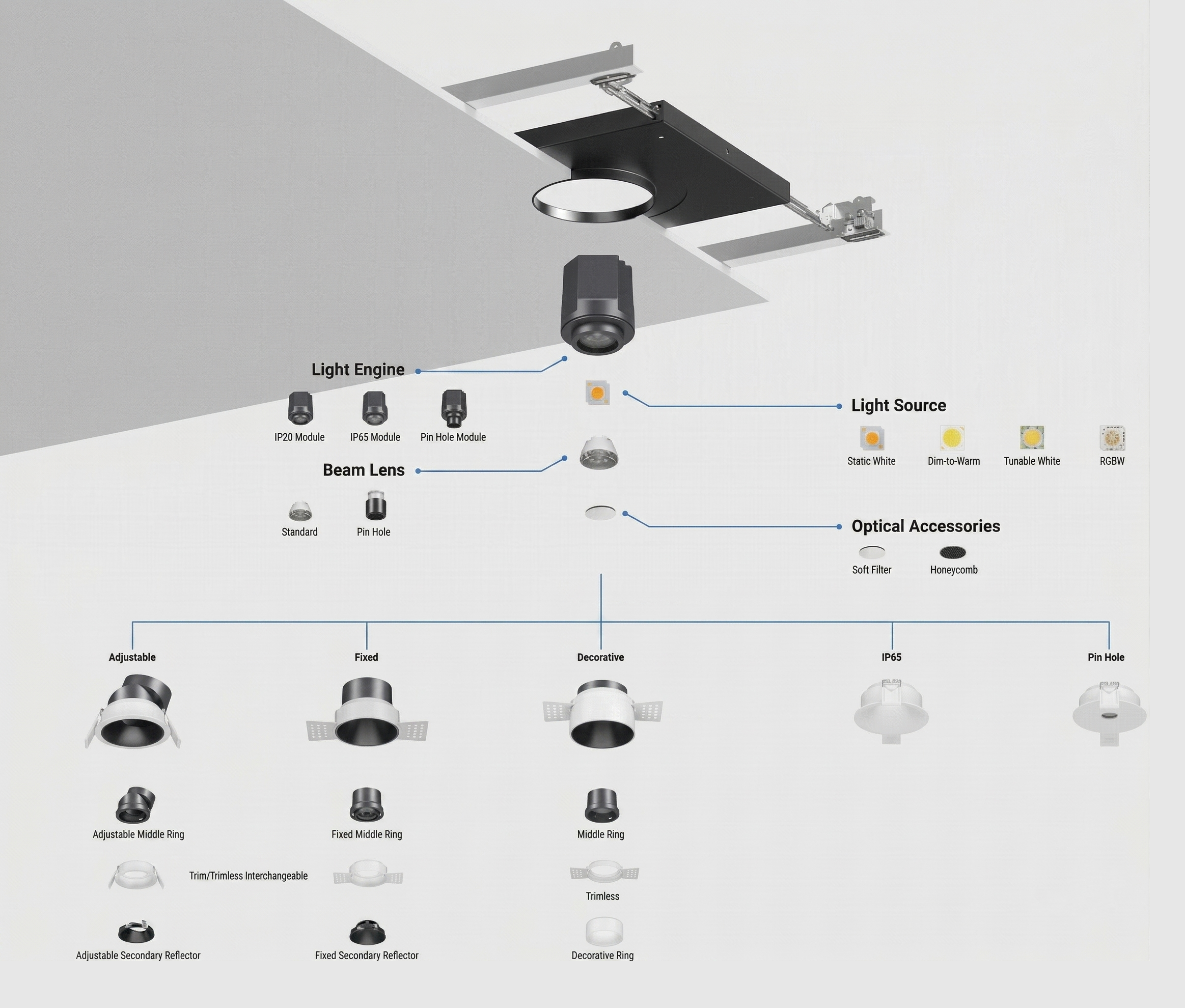 The 2″ Adjustable IC Rated Downlight is built around one principle: precision should not come at the cost of performance. At the center of the fixture is our SHIFT-AXIS optical system, which allows 5° to 20° of tilt adjustment and 355° of rotation without any loss of output or internal glare. Most adjustable downlights compromise beam integrity the moment they move off-axis. This one does not.