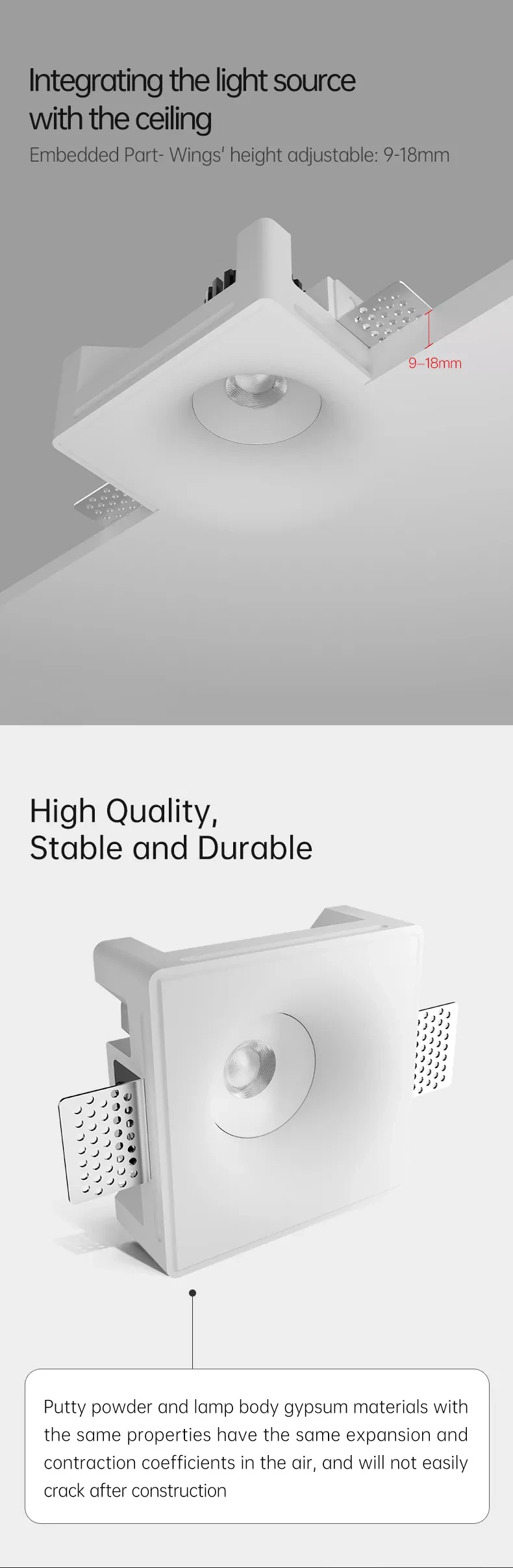 A 3 inch recessed concave gypsum downlight designed for fully seamless, trimless ceilings. The gypsum body muds in flush with drywall or plaster so the fixture disappears, leaving a clean concave light aperture. Inside, a high-CRI COB engine and deep anti-glare optics deliver smooth, controlled light with refined cut-off, while the aluminum heat sink keeps performance stable over time. Built for luxury residential, gallery, and hospitality interiors where the ceiling should feel uninterrupted and the light should look intentional.