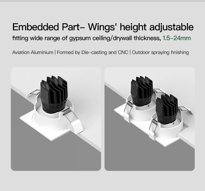 Constructed from high-quality aluminum, the fixture is built for long-term durability and efficient heat dissipation. With a total power consumption of 2 × 12W, it delivers strong illumination while remaining energy efficient. The no-plaster installation design simplifies fitting, making it suitable for both new builds and renovation projects.