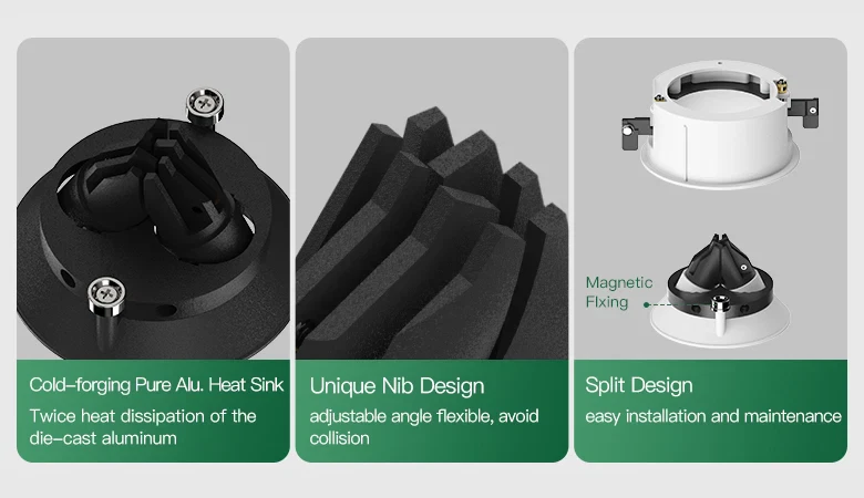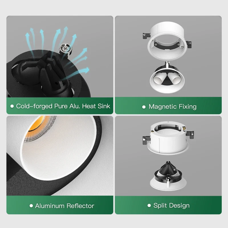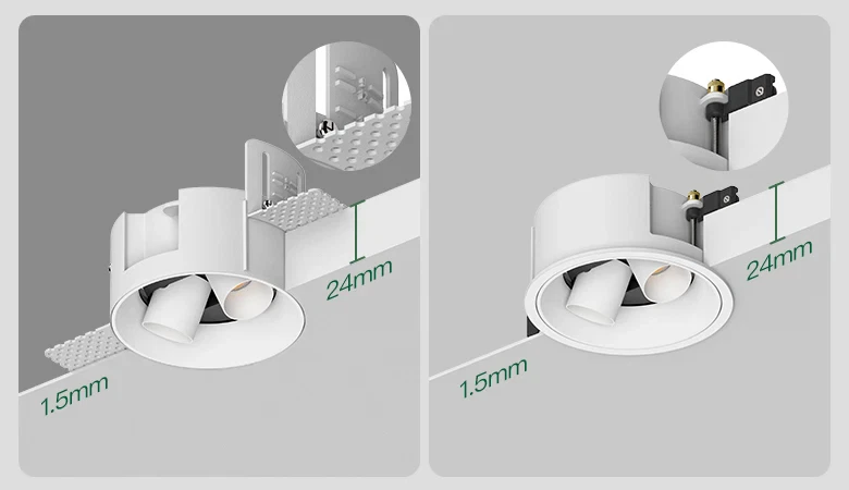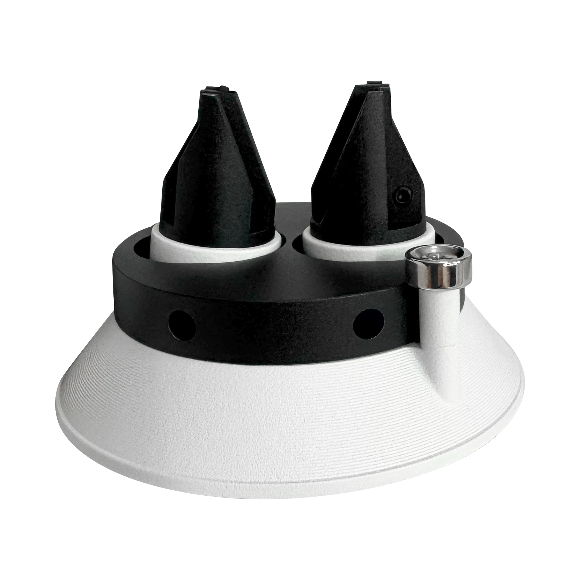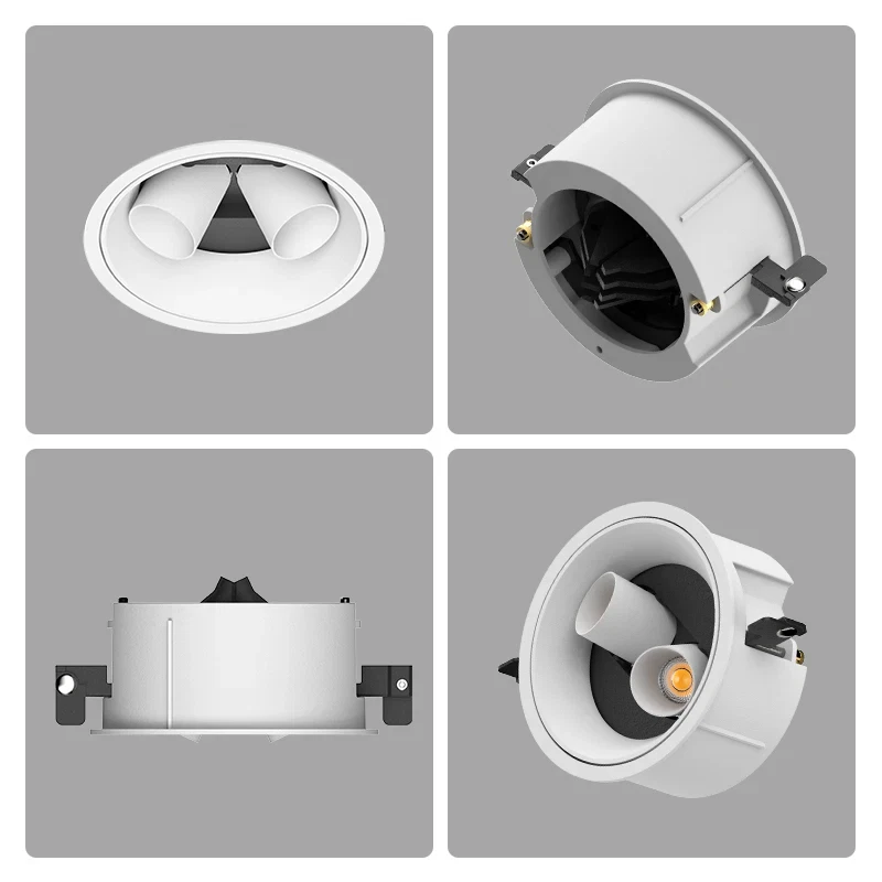 The Double Mini Spotlight offers an innovative lighting solution by integrating two independently adjustable spotlights into a single aperture. Each lamp head can rotate 360º horizontally and tilt 25º vertically, allowing for precise accent lighting that caters to a variety of settings such as residential, commercial, and hospitality spaces. Designed with a cold-forged pure aluminum heat sink and an aluminum reflector, this twin downlight ensures soft, uniform illumination while minimizing glare, providing optimal eye protection. The trimless installation creates a sleek, seamless appearance on ceilings, making the fixture as visually appealing as it is functional. Whether you’re looking to highlight architectural elements, artwork, or specific focal points, the Double Mini Spotlight delivers a versatile and efficient lighting solution.