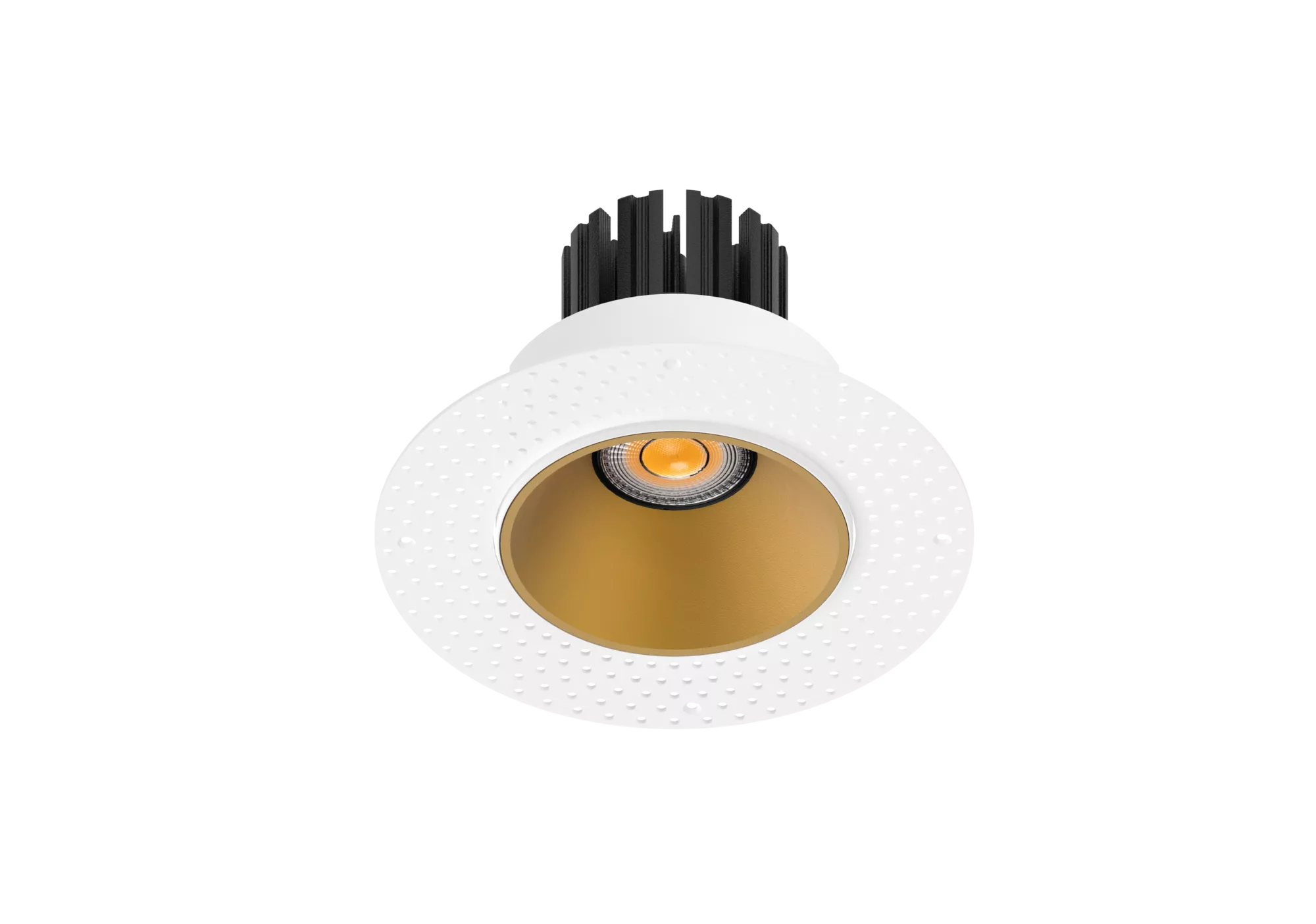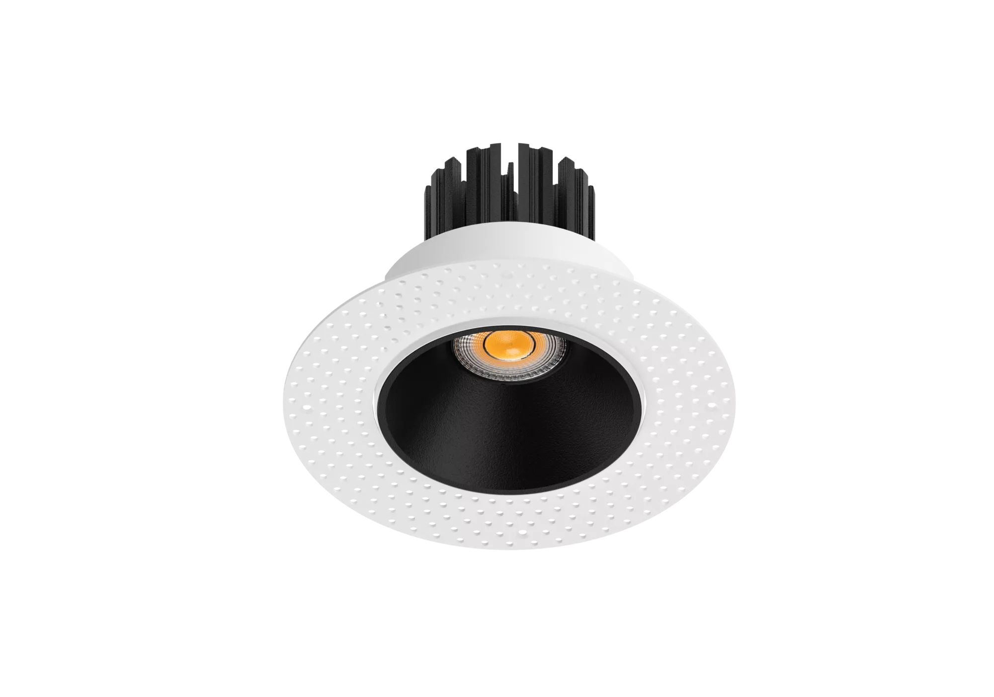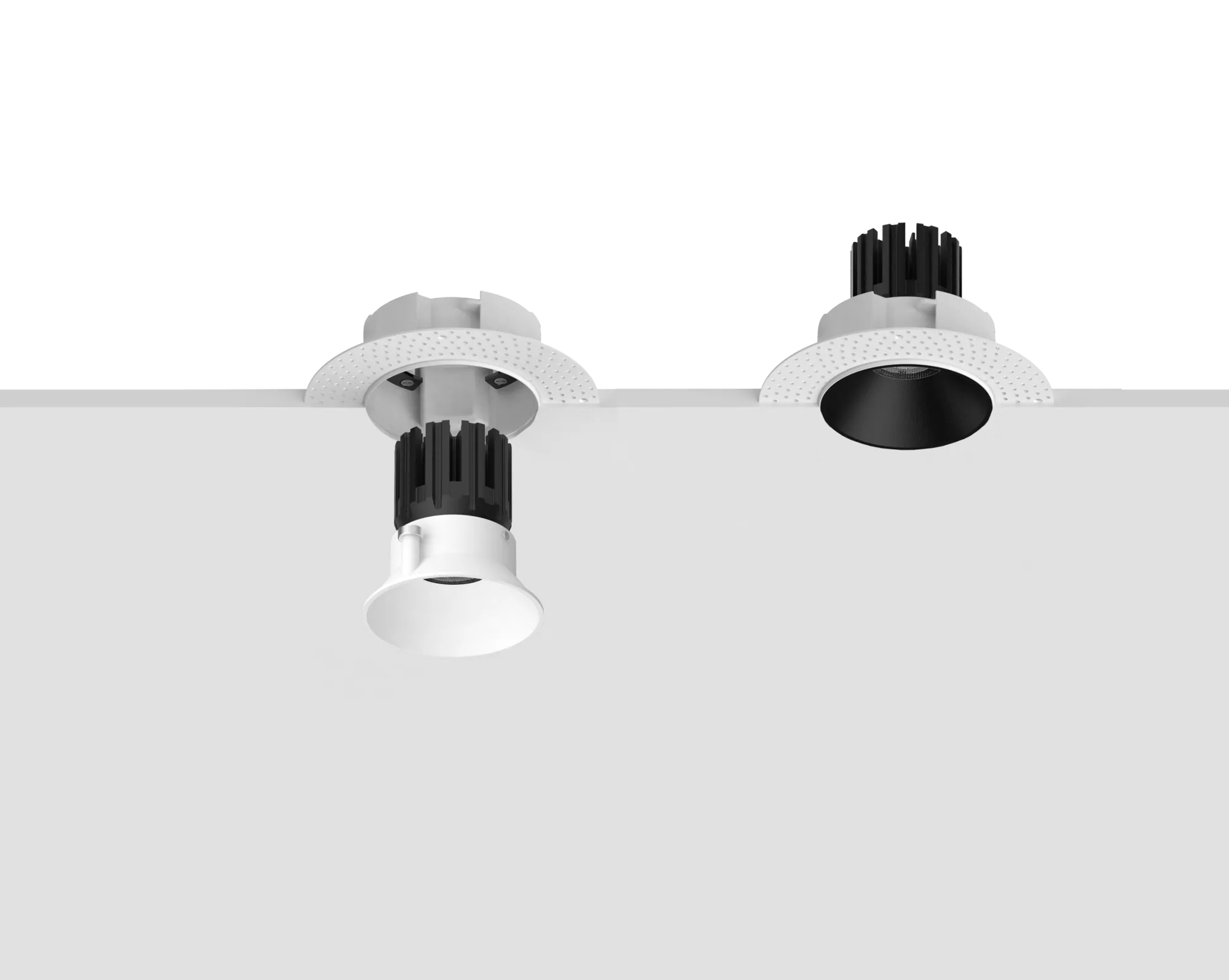 This fixture is offered in two ceiling expressions. The micro flange version provides a crisp, minimal border that finishes cleanly against drywall or wood ceilings. The trimless version is designed for plaster-in applications, disappearing into the ceiling once mudded and painted. Both versions share the same housing, optics, and light engine, so performance stays identical. You are only choosing the finishing style.