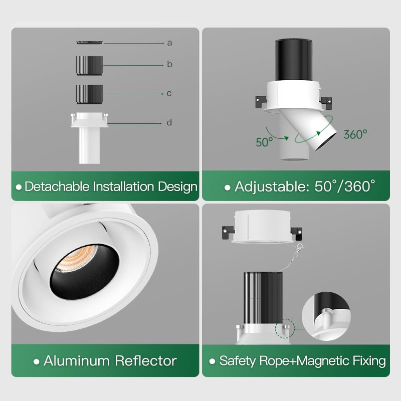 The Retractable Spot Light is a sleek, recessed spotlight engineered for glare-free, high-impact illumination. Its retractable design tilts up to 25°–75° for precise accenting of décor or architectural features, while the anti-glare lens delivers comfortable, soft lighting. Integrate seamlessly with Triac, 0-10V, or DALI dimming. Boasting a CRI of 97 and color temperatures ranging from 2700K to 5000K, this durable aluminum fixture offers accurate color rendering and efficient heat dissipation. Recessing smoothly into ceilings for a modern, refined look, it’s perfect for living rooms, offices, retail spaces, or galleries—bringing energy-efficient, flexible lighting to any environment.
