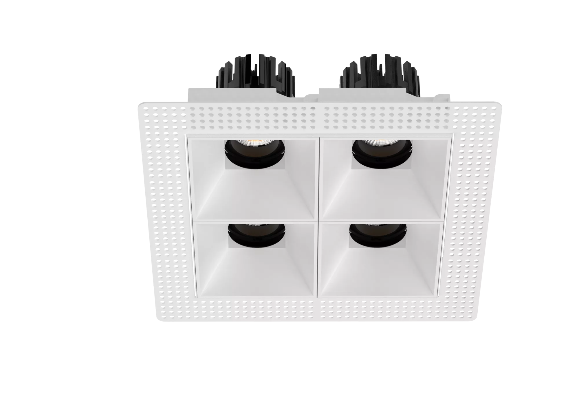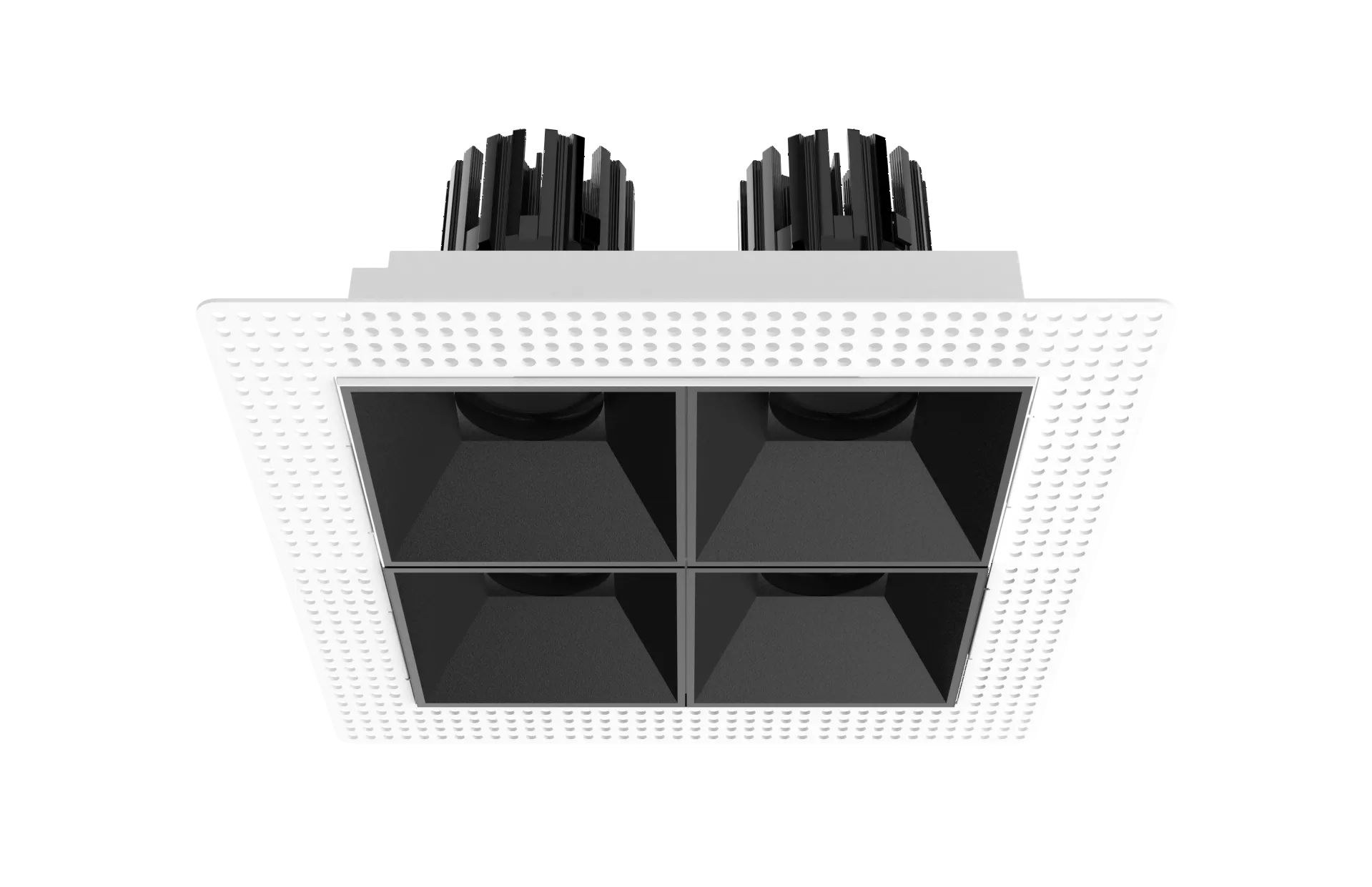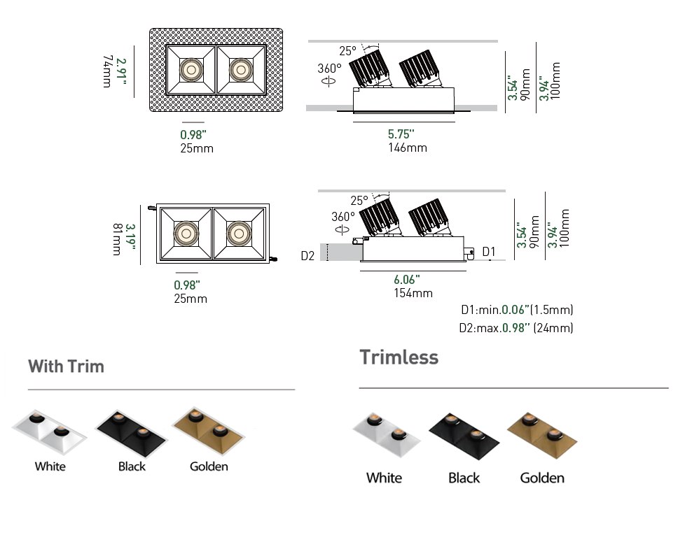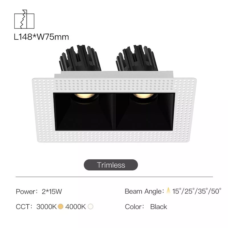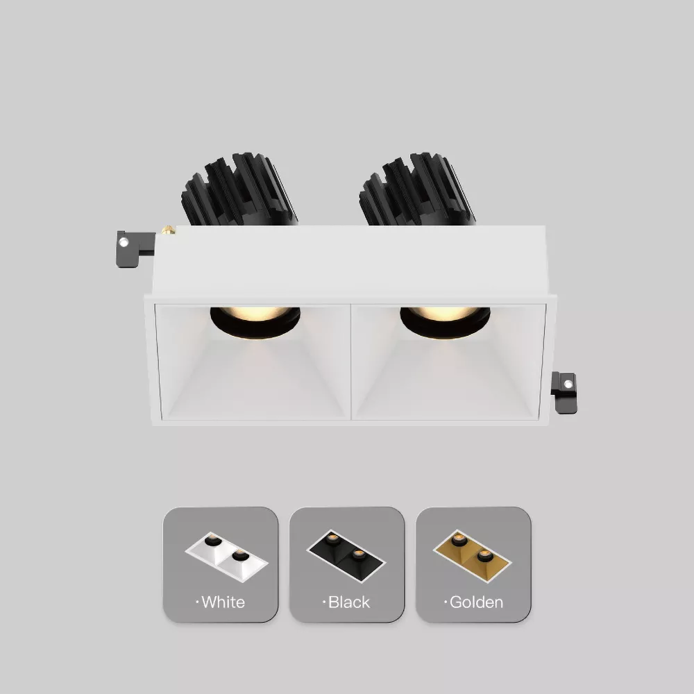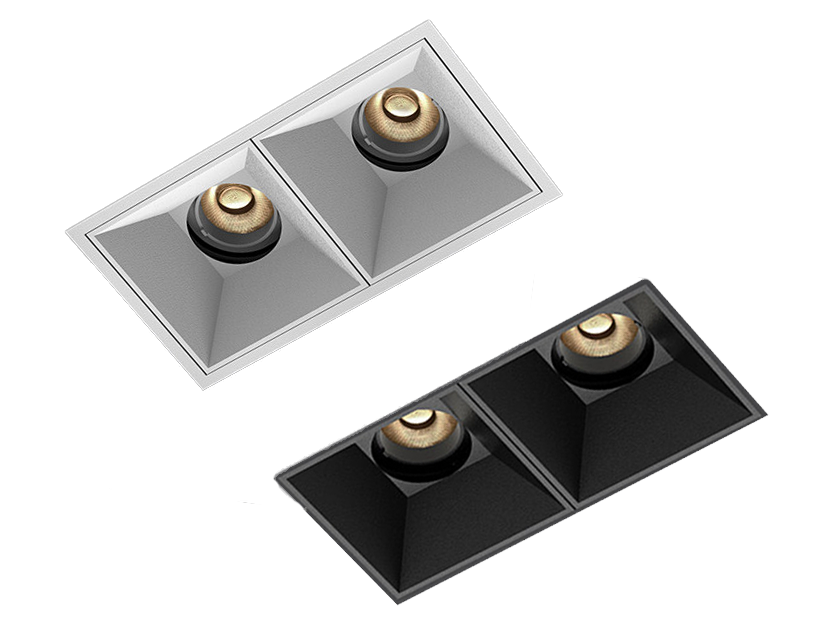 The 3 Inch Recessed Square Adjustable Double Downlight is designed for spaces that need more than one accent point without cluttering the ceiling. It comes in two trim styles so it fits different architectural finishes: a micro flange version with a clean, minimal border for a crisp detail, and a trimless version for a seamless plaster-in look. Same light engine and performance either way, just a different ceiling expression.