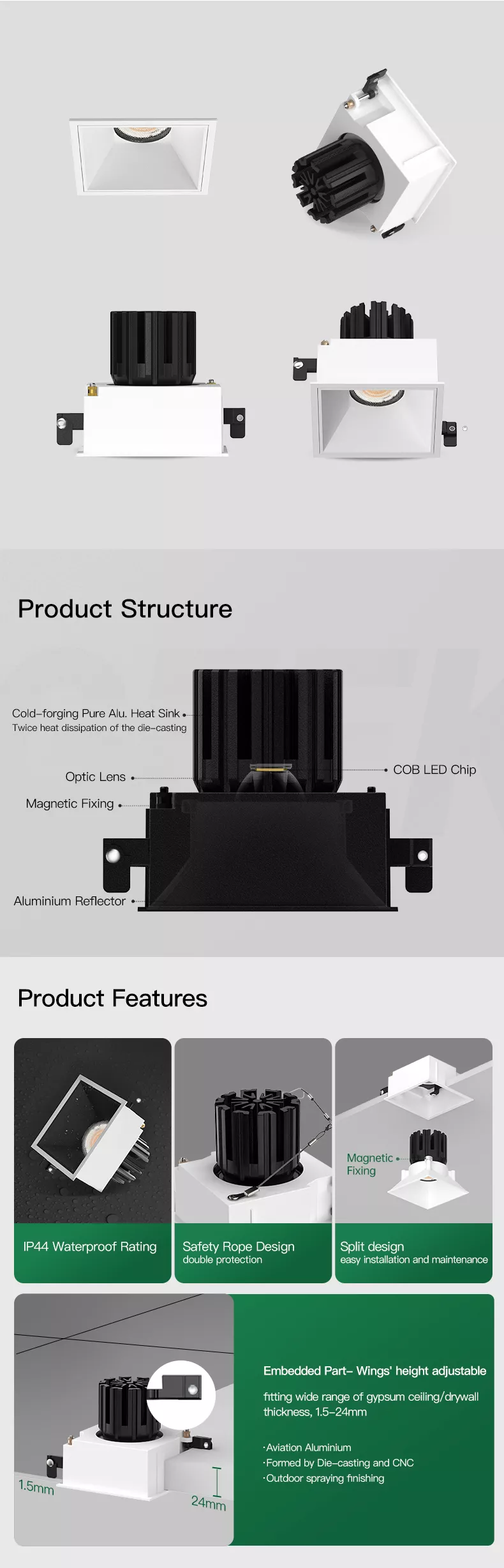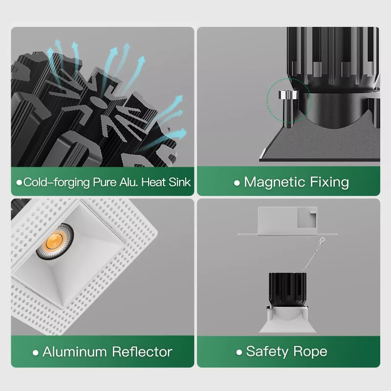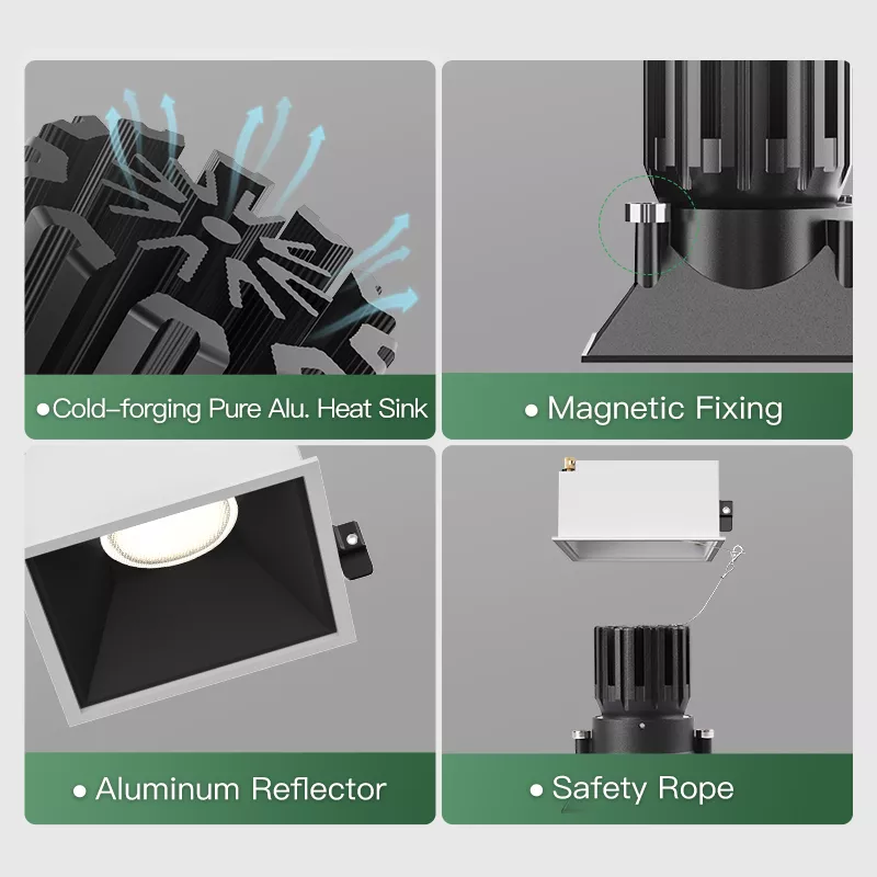 Thermal performance is handled properly through a cold-forged pure aluminum heat sink. Efficient heat dissipation reduces LED stress, supports longer life, and helps keep color and brightness stable over years of use, especially in smaller high-output downlights.
