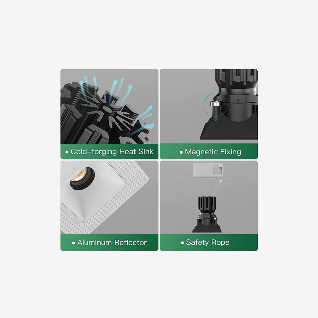 Thermal performance is handled properly through a cold-forged pure aluminum heat sink. Efficient heat dissipation reduces LED stress, supports longer life, and helps keep color and brightness stable over years of use, especially in smaller high-output downlights.