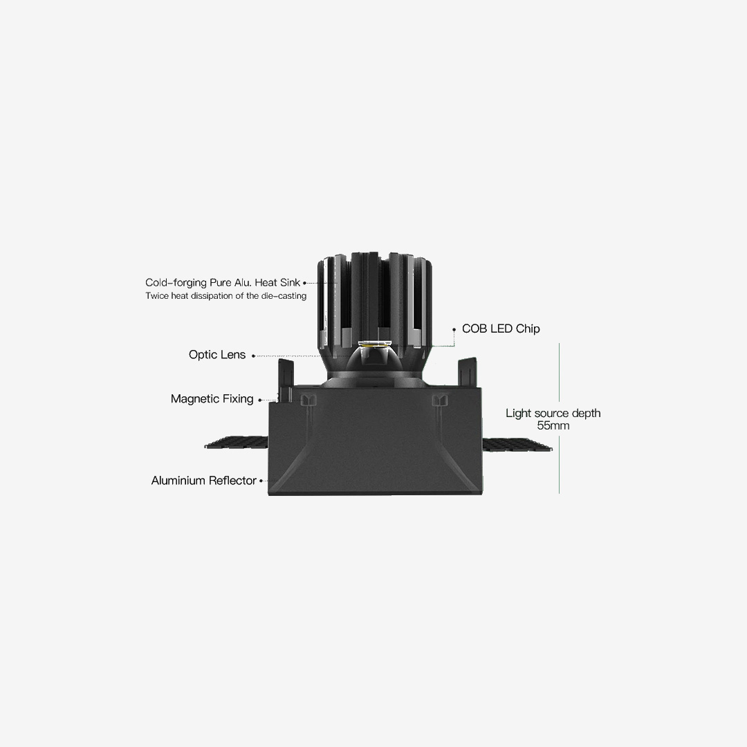Inside, the fixture uses a high-quality COB LED paired with a precision lens and aluminum reflector. This optical system concentrates light evenly, avoids harsh hotspots, and keeps glare under control, so the beam reads soft and refined rather than sharp or distracting. Multiple beam spreads are typically available, letting you spec the same fixture for ambient layers or tighter accents without changing the ceiling style.