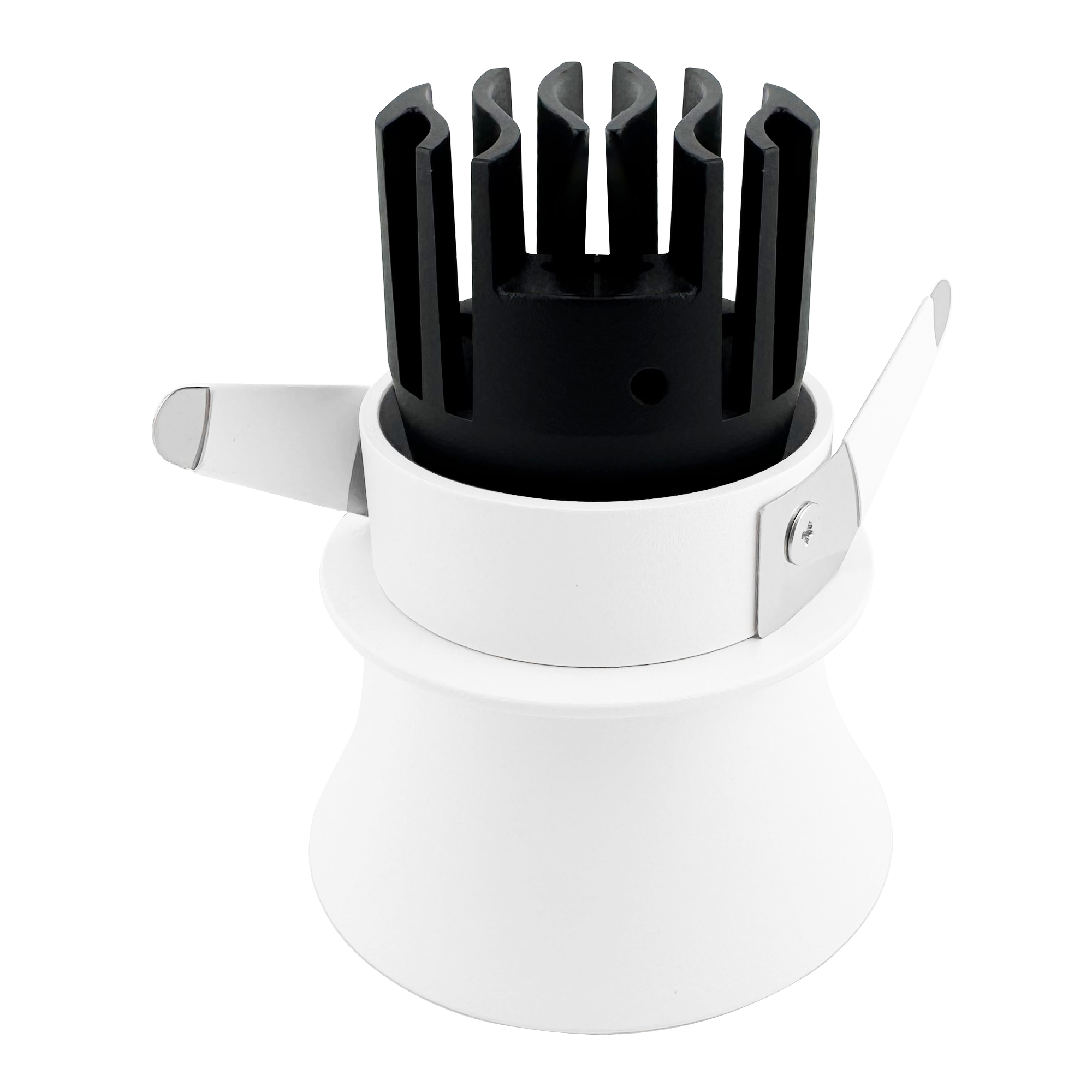 Recessed LED downlight with perforated trim, white bezel, and black aluminum heat sink isolated on transparent background
