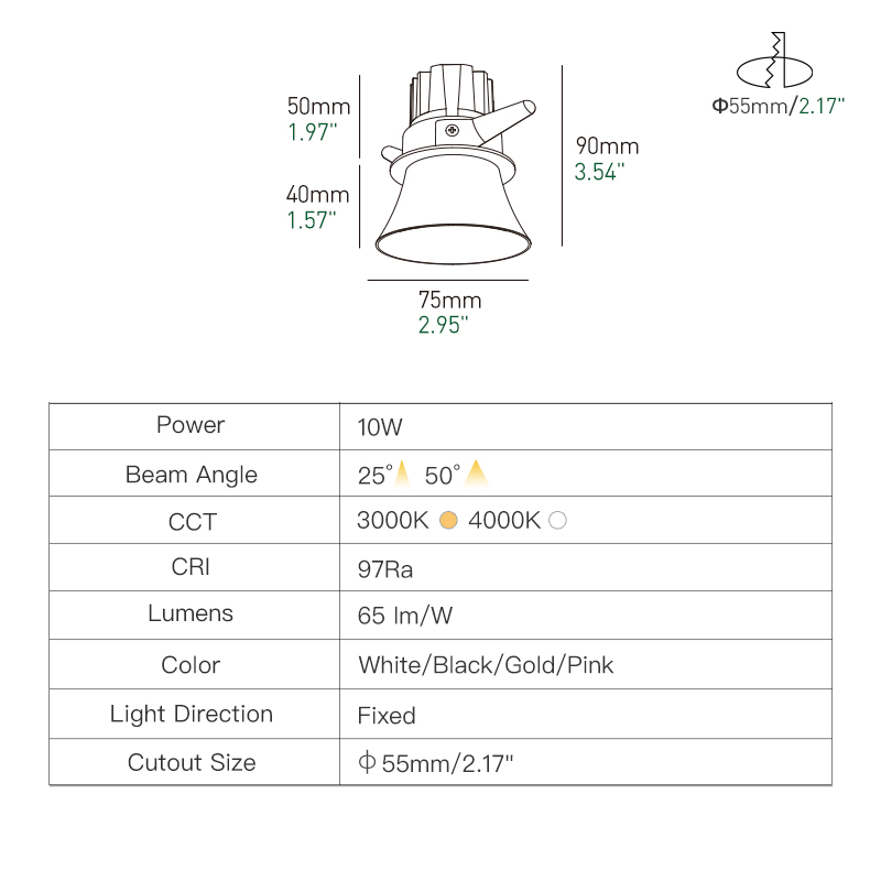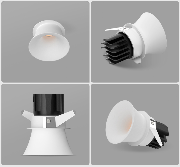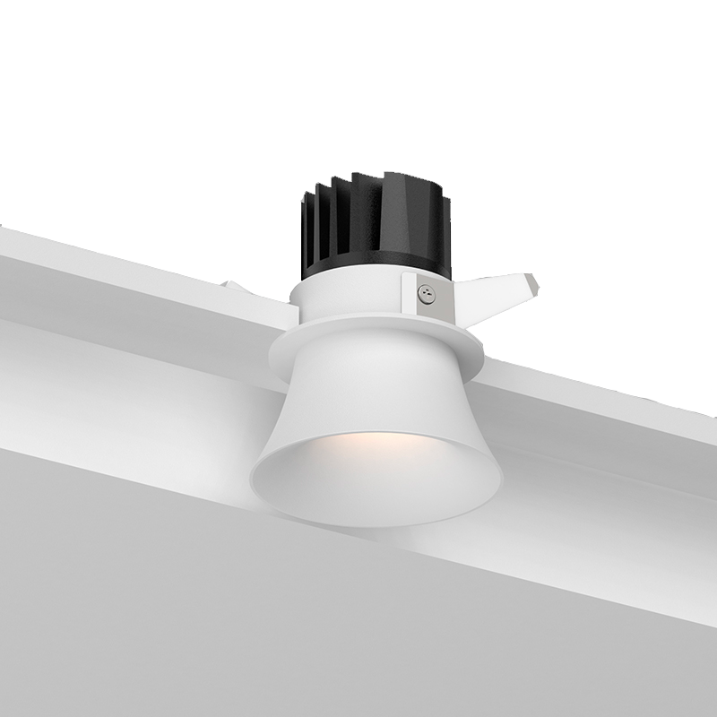 Light output is steady and controlled through a fixed optical system. The trumpet geometry naturally shields the source and reduces glare at common viewing angles, which keeps light comfortable in living areas, corridors, bedrooms, and hospitality spaces. The COB LED and aluminum reflector work together to produce an even beam with clean edges, avoiding harsh hotspots or messy spill.