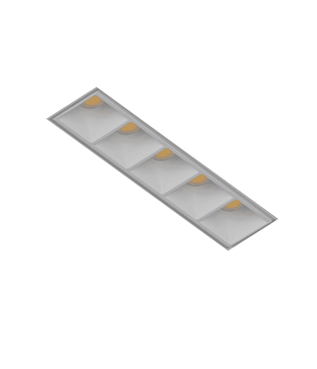 Light output is shaped through a multi-cell optical system that delivers consistent pools of light with refined cut-off. The cells work together to create even coverage along the linear axis, avoiding the uneven spacing and visual noise that can happen with separate downlights. Deep glare-control geometry and precision reflectors keep the beam comfortable in real spaces, especially in corridors or open areas where fixtures are within common sightlines.