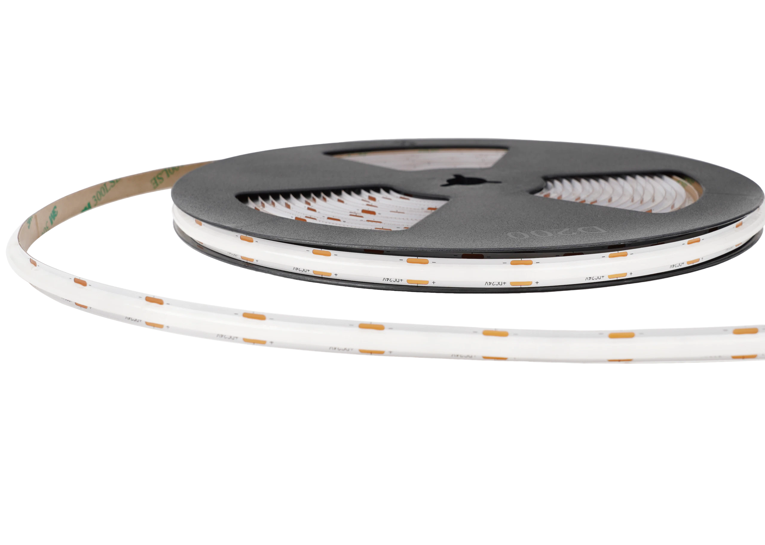 High density 8mm DOB LED tape with 288 LEDs per meter, 24V input, and CRI 90 for clean, uniform illumination. Designed for seamless linear lighting with no visible spotting, 180° beam spread, and a 5m roll format for architectural, millwork, and cove applications. UL listed and dimmable for professional installations.
