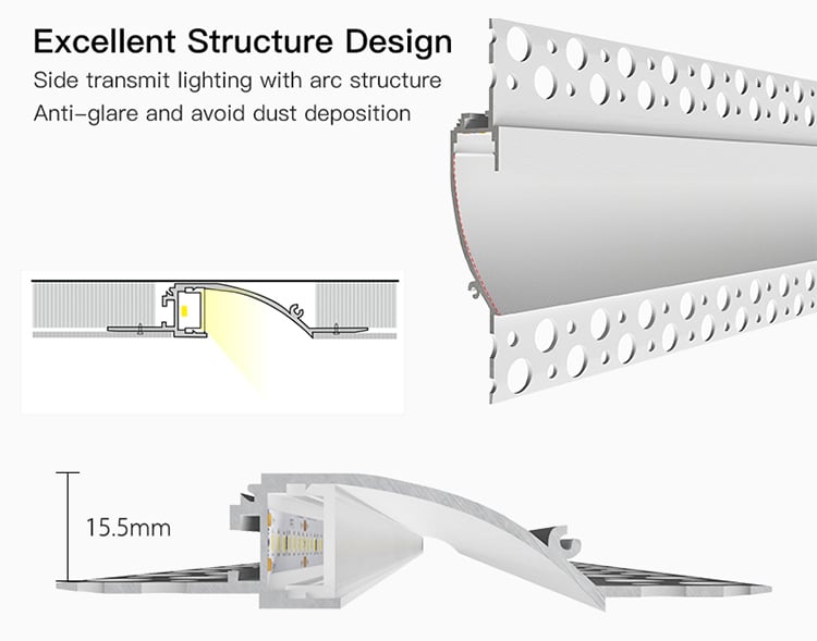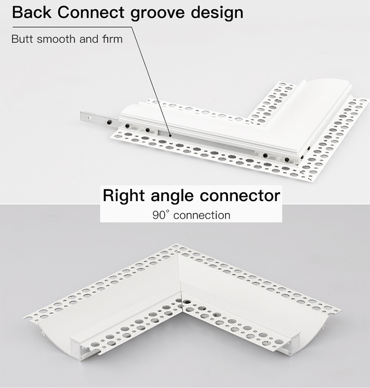 The Arc Trimless LED Wall Washer combines style and function to enhance modern interiors. Its curved aluminum profile design offers side-transmission lighting, casting a soft glow along walls and ceilings for an eye-friendly, glare-free environment. The plaster-in, trimless structure integrates smoothly into gypsum board, allowing for a flush finish that elevates architectural details. With a back connect groove and right-angle connectors, installation is both precise and flexible—simply plaster over, paint, and enjoy a clean, minimalist look. Durable construction resists dust and ensures longevity, making it perfect for living rooms, offices, and commercial spaces alike.
