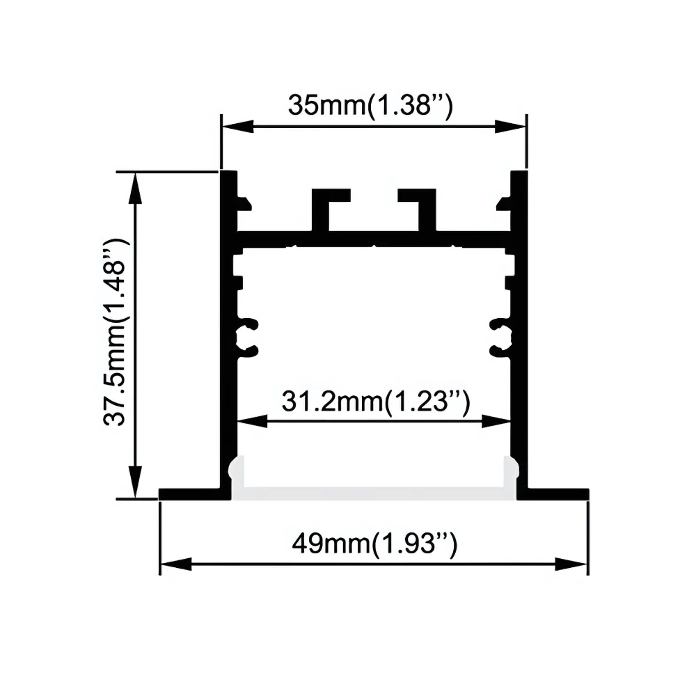 The LED Aluminum Channel for Strip Lights – RC3535 delivers sophisticated recessed lighting solutions for discerning lighting professionals and design enthusiasts. This premium channel features generous dimensions of 35mm width by 37.5mm height, with an impressive 31.4mm internal mounting area that accommodates the FL2835-120-8mm LED strips (12V/24V, 13W/m, 1350LM/m) with ample space for optimal heat dissipation. Crafted from high-quality AL6063-T5 aluminum, the RC3535 provides superior thermal management to maximize LED performance and extend operational lifespan. What distinguishes this channel is its elegant recessed design, creating a clean, architectural appearance with the light source integrated seamlessly into ceilings, walls, or cabinetry for a sophisticated, built-in aesthetic. The overall mounting width of 49mm ensures secure installation in various surfaces, while the included spring clips provide straightforward and reliable fixture placement. The professional-grade PMMA opal diffuser transforms concentrated LED points into a smooth, uniform glow that enhances visual comfort without sacrificing brightness. Available in three premium finishes—silver, black, or white—to complement any interior design scheme, each 2-meter length comes complete with matching endcaps for a polished, finished appearance. The RC3535 recessed aluminum channel is ideal for creating discreet ambient lighting in luxury residential environments, elegant hospitality spaces, upscale retail displays, and contemporary office interiors where sophisticated, integrated illumination is desired. This premium housing solution elevates standard LED strip lights into professional architectural lighting features that blend seamlessly with surrounding surfaces while delivering exceptional illumination quality.