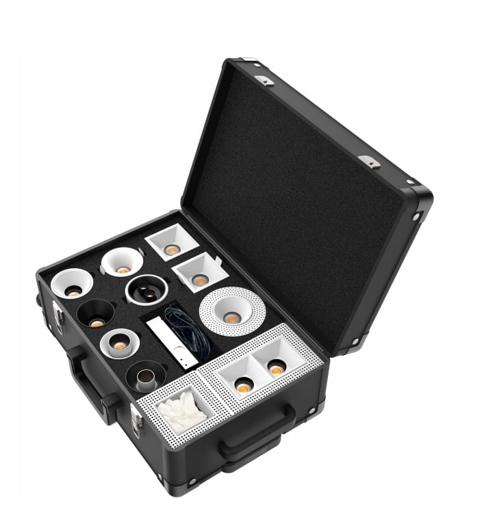 A portable Nuordic demo luggage case built for resellers and showrooms. It neatly holds a curated set of recessed downlights and spotlights so you can present finishes, trims, and beam effects in person. Rugged hard case exterior, precision foam interior, and a clean layout that makes client meetings feel organized and premium.
