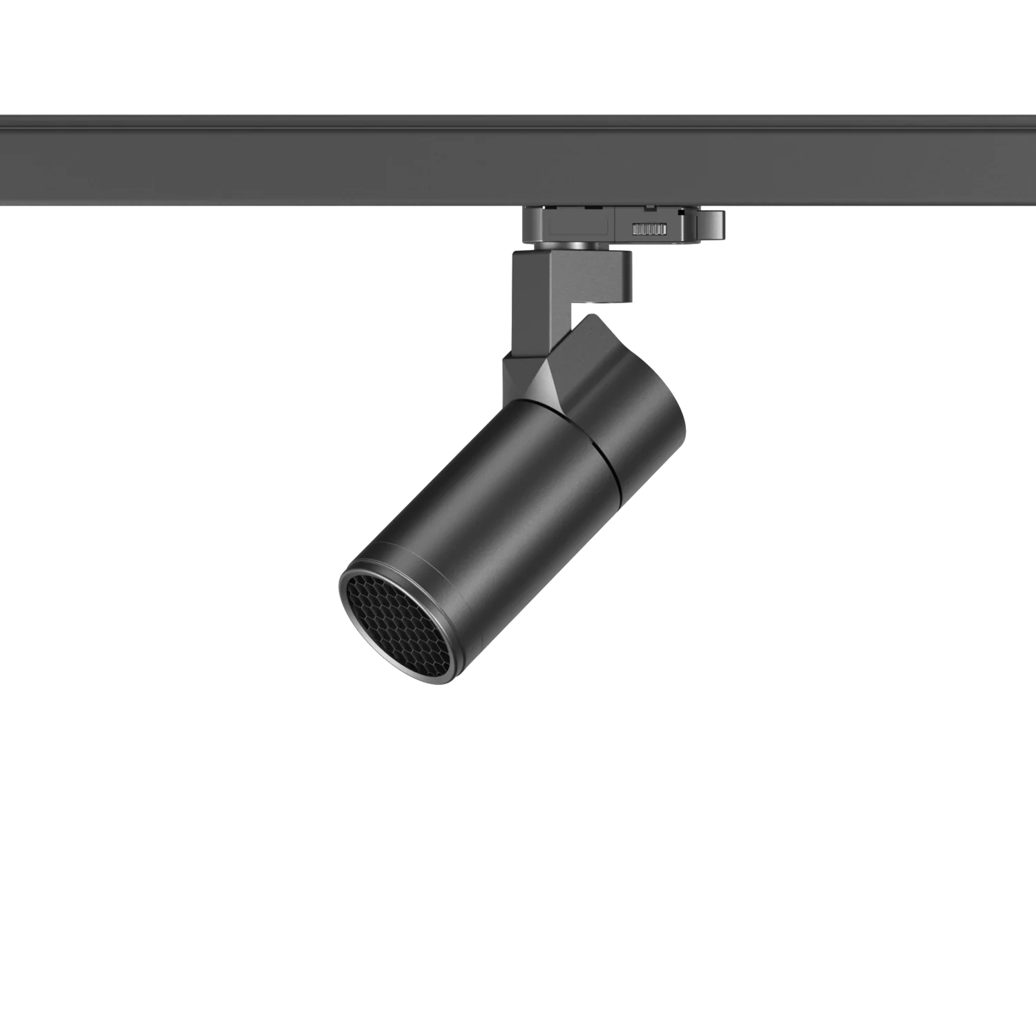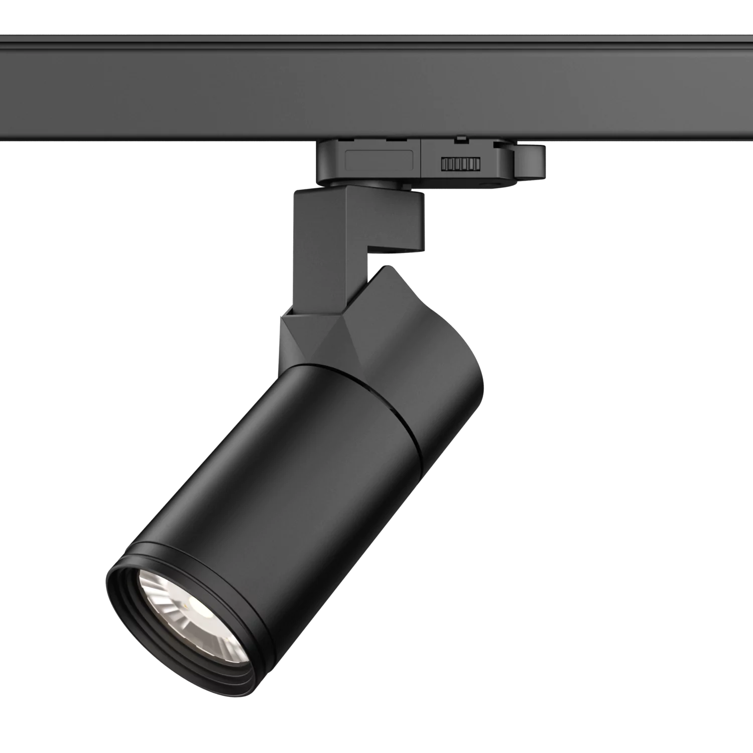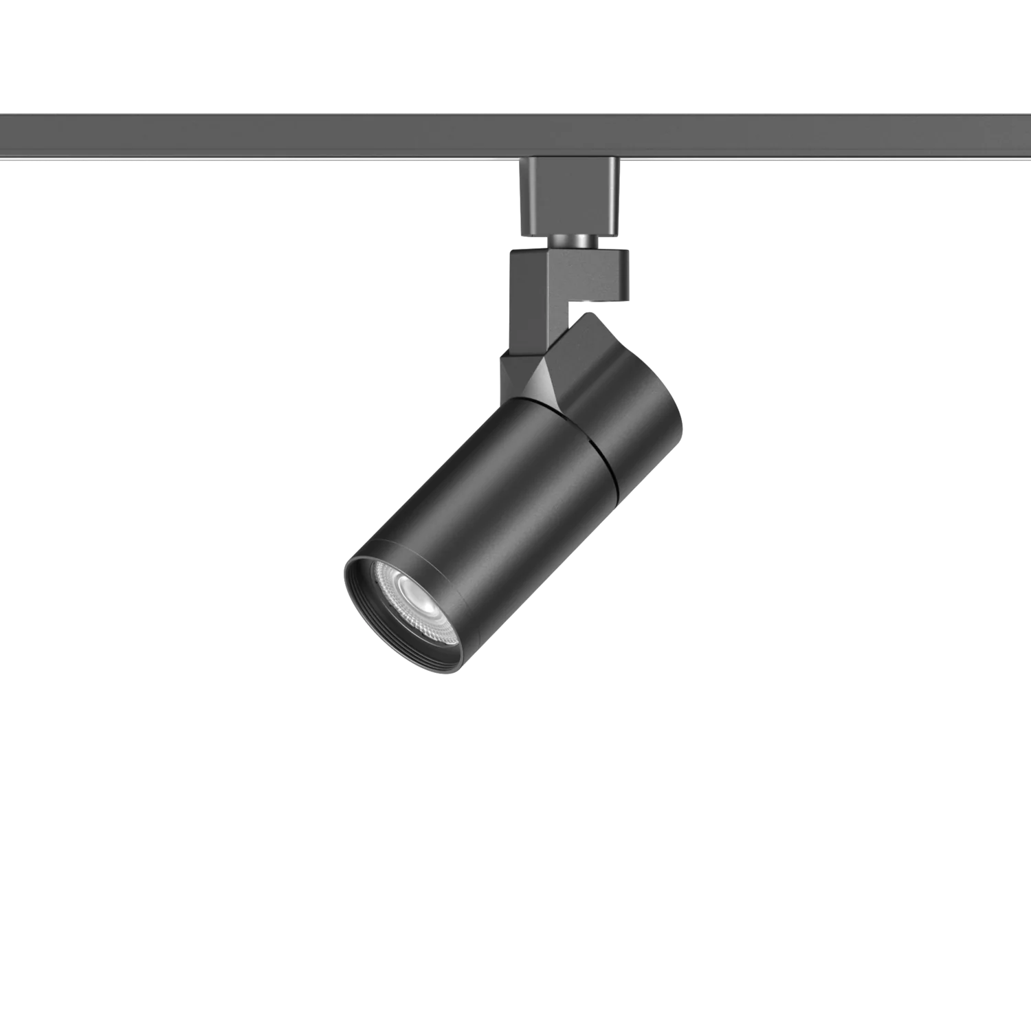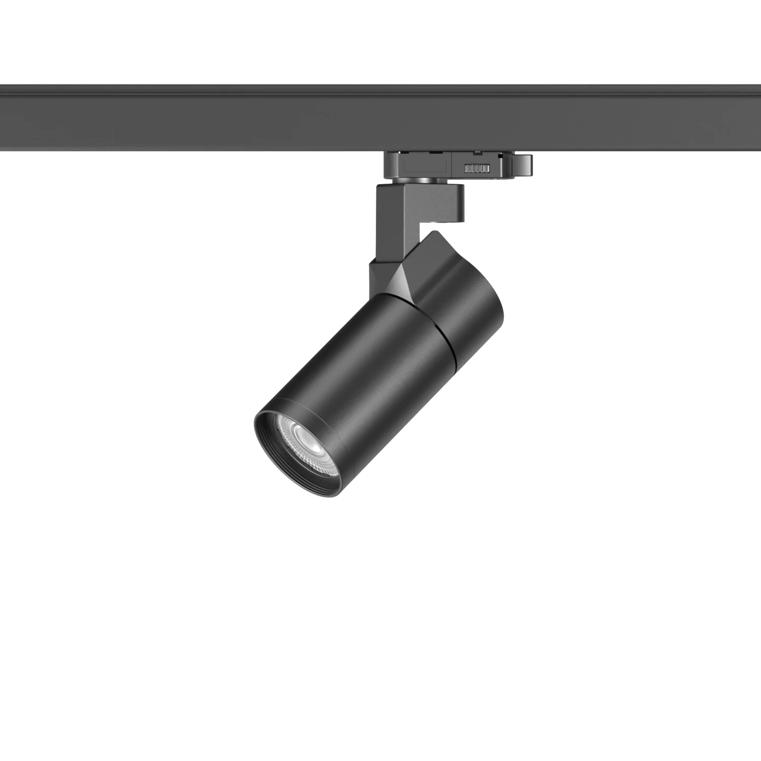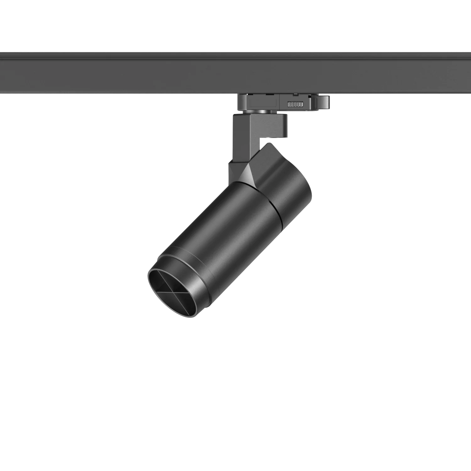Black cylindrical LED track light with adjustable spotlight head mounted on ceiling rail